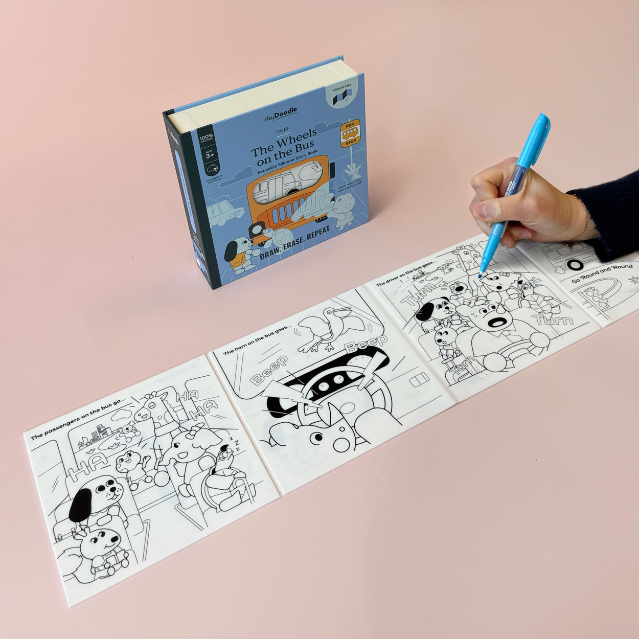 „Wheels on the Bus” to klasyczna rymowanka, której dzieci się uczą zaczynając przygodę z językiem angielskim. Australijska firma HeyDoodle proponuje ją w formie książeczki, którą dzieci mogą kolorować, czytać i się uczyć. Zaśpiewaj piosenkę o autobusie i pasażerach, którzy nim jadą i ożyw piosenkę poprzez pokolorowanie uroczych obrazków. Po zabawie pokolorowaną książeczkę można wyczyścić i użyć ponownie i ponownie kolorując, śpiewając i ucząc się! Po każdym kolorowaniu książeczka nabierze innych barw i historia będzie opowiedziana na nowo.
