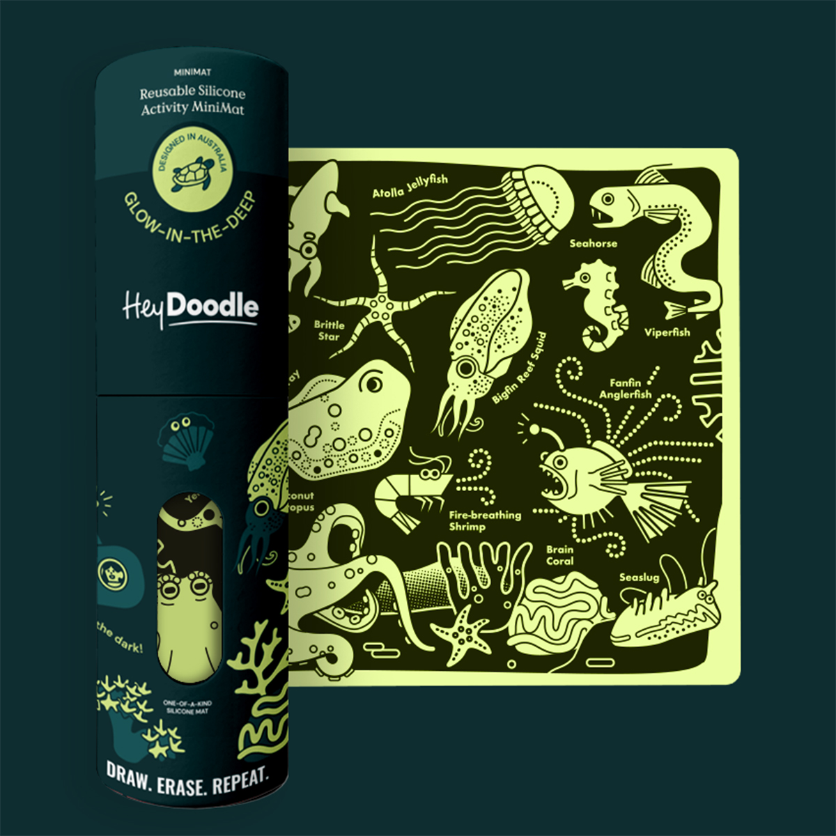 Jak wszystkie maty HeyDoodle, świecąca w ciemności mata jest ekologiczna, nietoksyczna i zaprojektowana do wielokrotnego użytku. Mata wykonana jest w całości z najwyższej jakości silikonu.