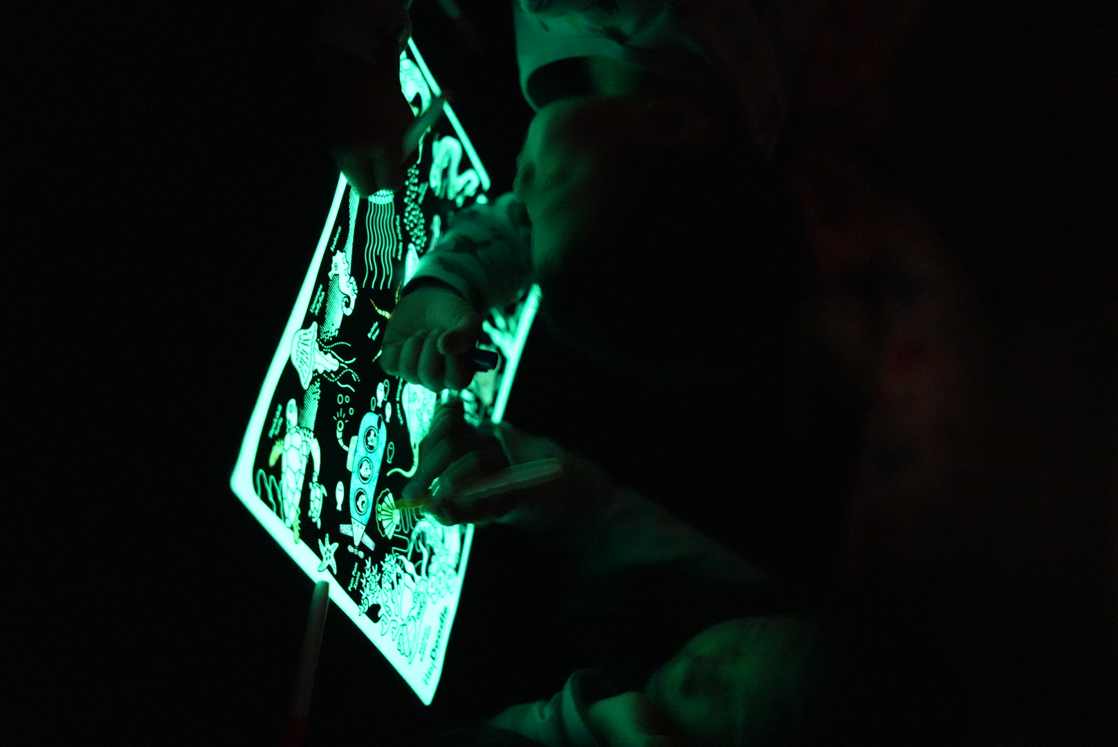 Koloruj i rysuj, daj się ponieść podwodnej przygodzie. Zanurz się w głębiny łodzią podwodną i odkryj świecący podwodny świat - niezwykłe ryby, ośmiornica, meduza, rafa koralowa i wiele innych niezwykłych stworzeń. Silikonowa mata A4 ma do kolorowania bioluminescencyjne stworzenia żyjące w głębinach oceanów. Zgaś światło i zobacz jak świecą w ciemności. Po zabawie matę można wyczyścić i użyć ponownie, ponownie i ponownie kolorując i ucząc się!