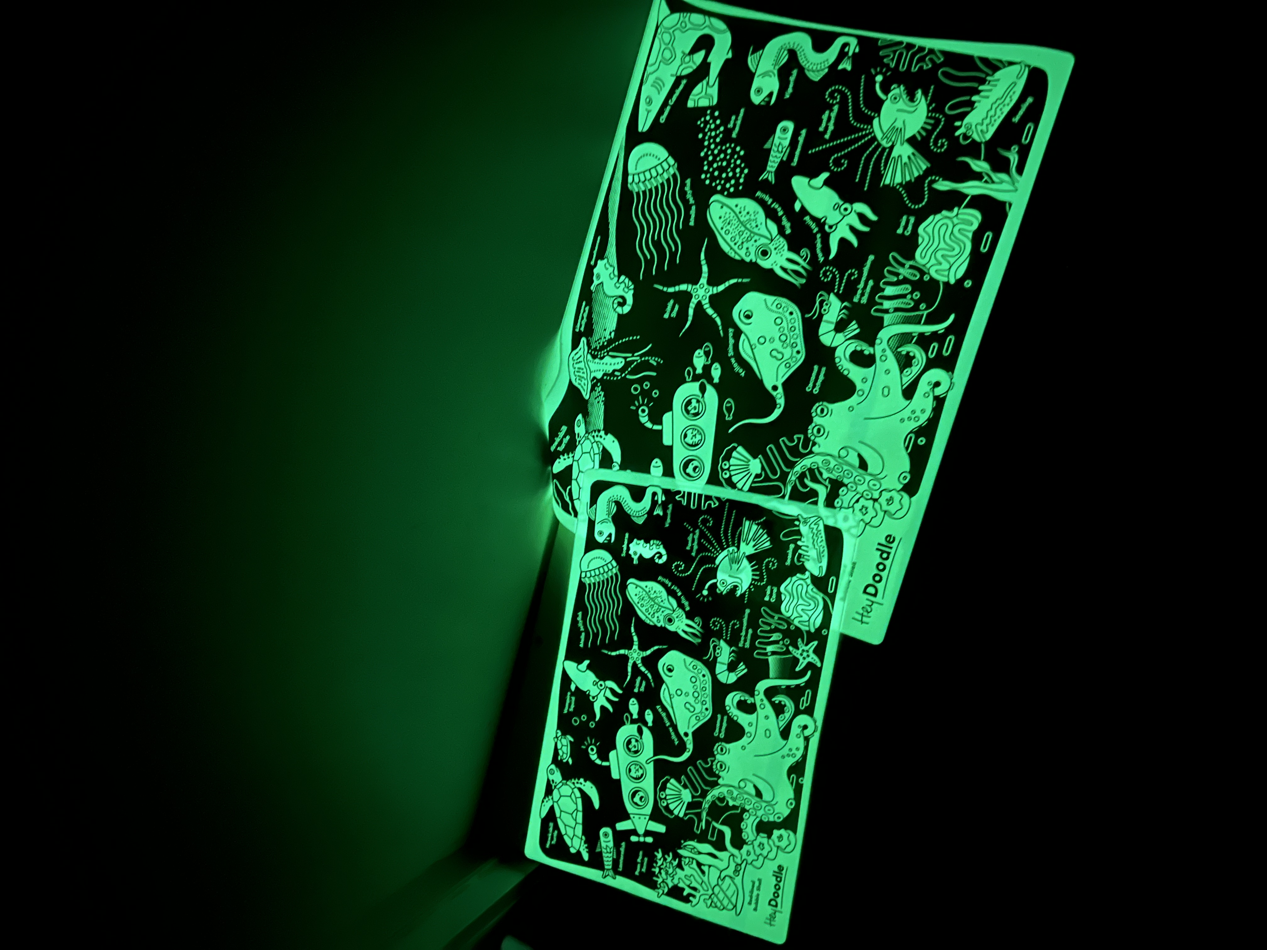 - Świecąca w ciemności mata do wielokrotnego kolorowania z obrazkiem podwodnego świata.